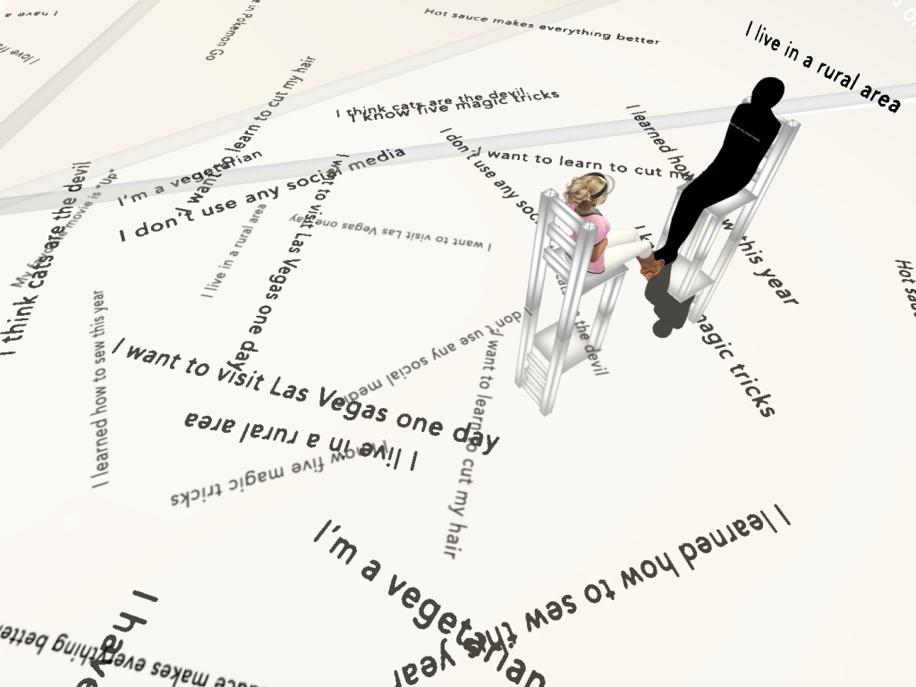 There are anonymous figures seated all over the parcel , spaced of course, surrounded by their thoughts. I sat across from one and quietly considered the words on the ground and floating up into the air to see what who this figure was... is ... Reflection on the words is right. There is so much for thought about those we know and those we don’t know. They are all different , or the same, depending on me and my reaction . So much for thought there . Go see. It is an amazing example of the creativity of Fionafei, the artist in second life, and deep empathy. http://maps.secondlife.com/secondlife/SL17B%20Electrify/97/151/23